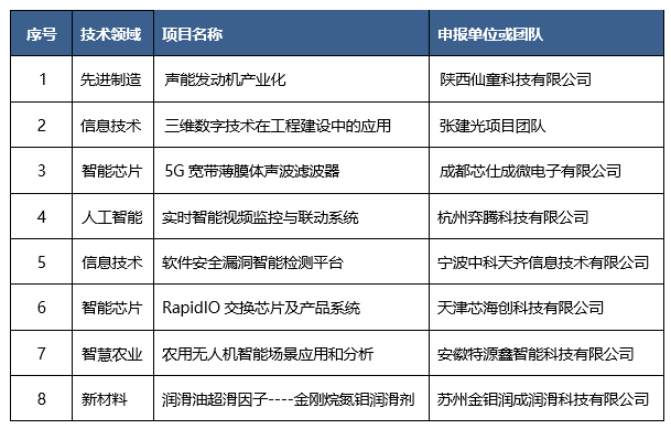 自启动以来,大赛得到有关各方的积极响应,共有来自各领域的百余个项目报名参赛。经过知识产权行业内权威专家对报名项目进行全面评估,逐一筛选,最终确定以下八个项目入围2019第五届“中知在线”杯知识产权运营大赛决赛。具体如下:
