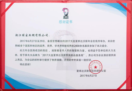 在2017年夏季达沃斯论坛中,经过层层筛选,成为“2017夏季达沃斯贵宾床品服务商”。随着“郝太太”品牌影响力的提升和蚕丝被现场拉制市场空间的扩大,不法商家受经济利益驱使,钻漏洞抢注商标,进行同性质市场业务。