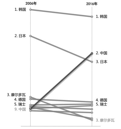 韩国知识产权对国内GDP的贡献率最高,在这方面中国的增长速度最快,从2006年的第九名进入到2016年的第二名。(本文图表数据来源:世界知识产权组织 记者、制表人:卢重光)