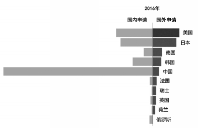 2016年,全球范围的有效专利是1180万件,其中美国是280万件,日本是200万件,中国是180万件。前五个国家的有效专利占世界的68.6%