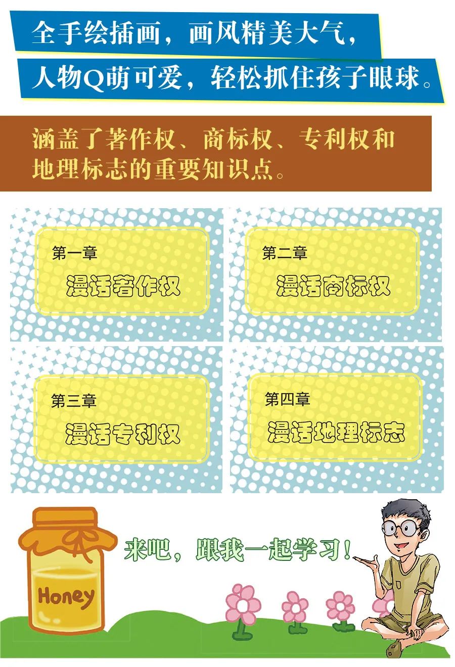 摘要:本书以漫画的形式,将吨吨、咕咕、饭饭三个小朋友和刘老师作为主线人物,通过展现课堂学习和日常生活的所见所闻,用通俗易懂的表达方式向同学们普及知识产权法律知识。全书共分为4个章节,涵盖了著作权、商标权、专利权和地理标志的重要知识点。