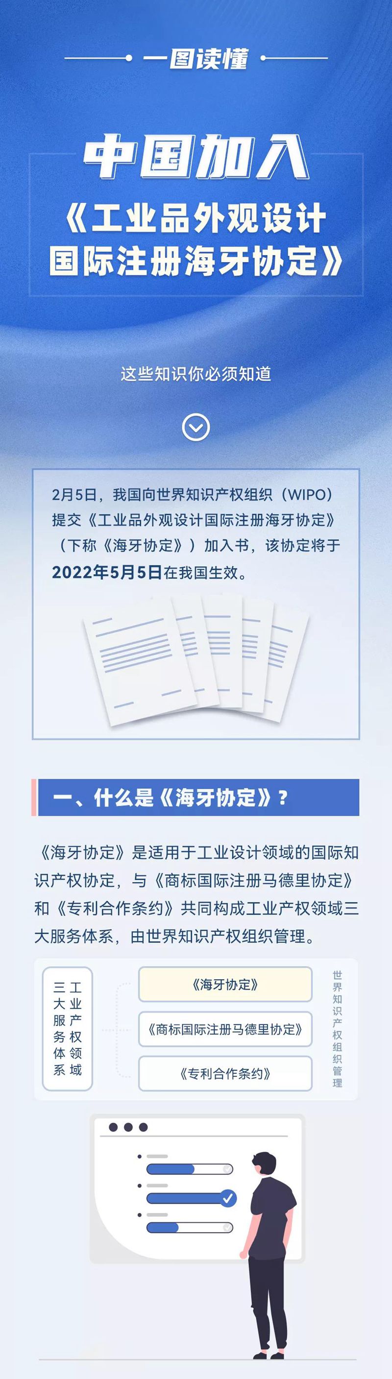 摘要:2月5日,我国向世界知识产权组织(WIPO)提交《工业品外观设计国际注册海牙协定》加入书,该协定将于今年5月5日在我国生效。