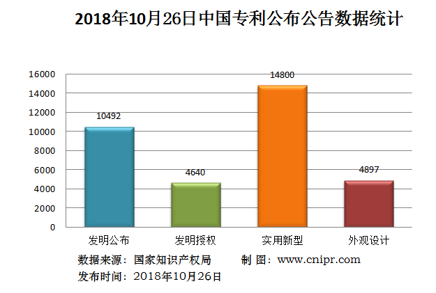 2018年10月26日,中国专利公布数据统计共34829件,其中:发明专利公布10492件;发明专利授权4640件;实用新型专利公告14800件;外观设计专利公告4897件。