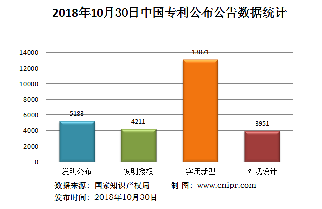 2018年10月30日,中国专利公布数据统计共26416件,其中:发明专利公布5183件;发明专利授权4211件;实用新型专利公告13071件;外观设计专利公告3951件。