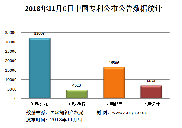 2018年11月6日,中国专利公布数据统计共59961件,其中:发明专利公布32008件;发明专利授权4623件;实用新型专利公告16506件;外观设计专利公告6824件。
