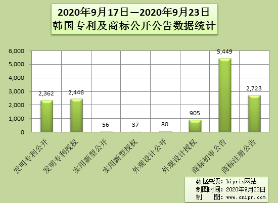 2020年9月17日—2020年9月23日韩国专利及商标公开公告数据统计