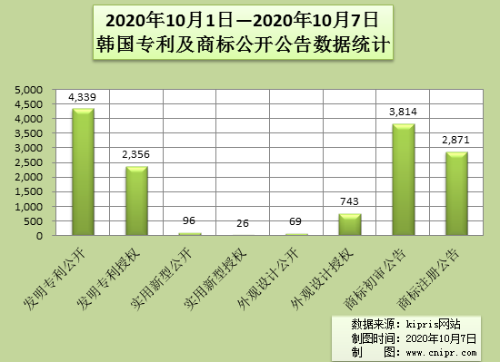 2020年10月1日—2020年10月7日韩国专利及商标公开公告数据统计
