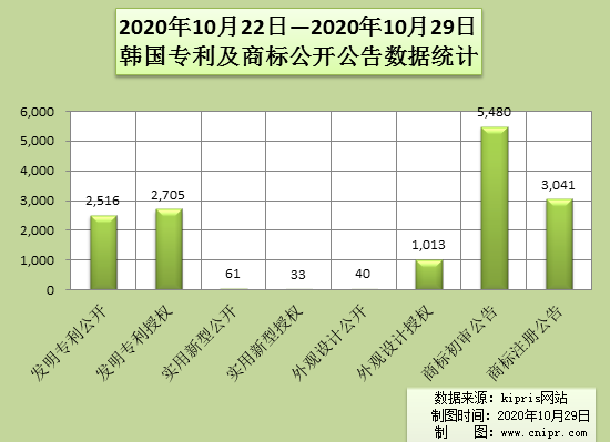 2020年10月22日—2020年10月29日韩国专利及商标公开公告数据统计