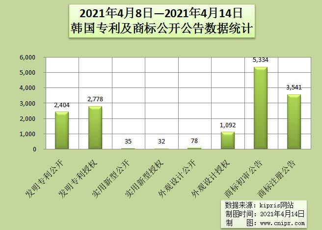 2021年4月8日—2021年4月14日韩国专利及商标公开公告数据统计