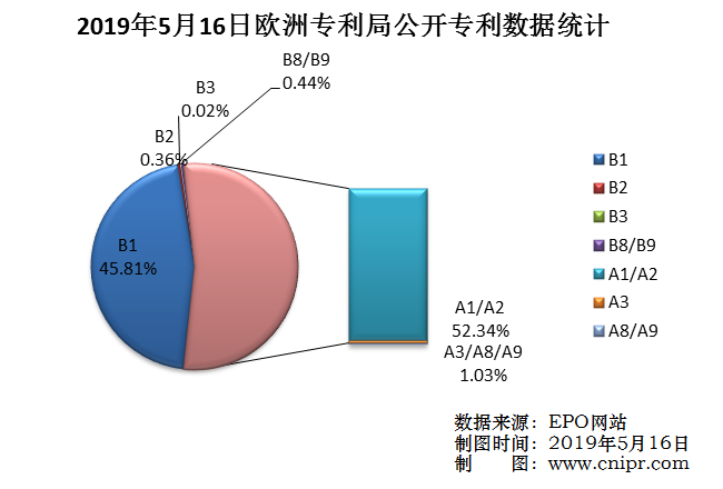 2019年5月16日,欧洲专利局(EPO)公开A类以及B类专利5894件。公布的授权专利(B1):2700件,占总公开量的45.81%;新的专利说明书(B2):21件,占总公开量的0.36%;经限制性修改程序修改后再次公告出版的说明书(B3):1件,占总公开量的0.02%;授权专利扉页的更正/授权专利全文的更正(B8/B9):26件,占总公开量的0.44%;公开新增专利(A1/A2):3085件,占总公开量的52.34%;检索报告(A3):58件,占总公开量的0.98%;扉页的更正/全文说明书的更正(A8/A9):3件,占总公开量的0.05%。