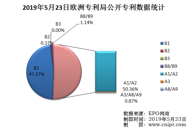 2019年5月23日,欧洲专利局(EPO)公开A类以及B类专利5983件。公布的授权专利(B1):2828件,占总公开量的47.27%;新的专利说明书(B2):22件,占总公开量的0.37%;经限制性修改程序修改后再次公告出版的说明书(B3):0件,占总公开量的0.00%;授权专利扉页的更正/授权专利全文的更正(B8/B9):68件,占总公开量的1.14%;公开新增专利(A1/A2):3013件,占总公开量的50.36%;检索报告(A3):52件,占总公开量的0.87%;扉页的更正/全文说明书的更正(A8/A9):0件,占总公开量的0.00%。