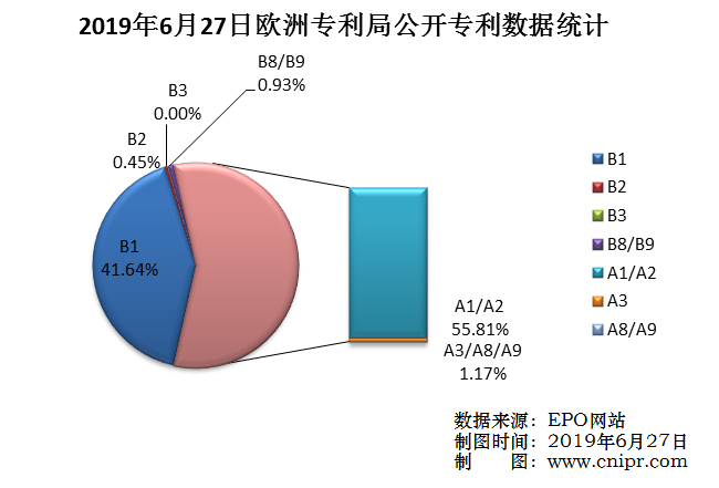 2019年6月27日,欧洲专利局(EPO)公开A类以及B类专利6472件。公布的授权专利(B1):2695件,占总公开量的41.64%;新的专利说明书(B2):29件,占总公开量的0.45%;经限制性修改程序修改后再次公告出版的说明书(B3):0件,占总公开量的0.00%;授权专利扉页的更正/授权专利全文的更正(B8/B9):60件,占总公开量的0.93%;公开新增专利(A1/A2):3612件,占总公开量的55.81%;检索报告(A3):76件,占总公开量的1.17%;扉页的更正/全文说明书的更正(A8/A9):0件,占总公开量的0.00%。
