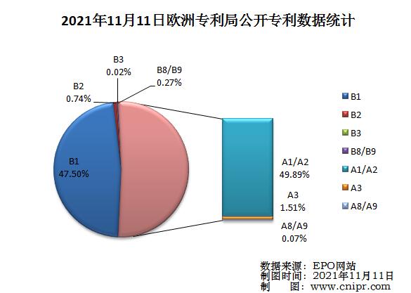 2021年11月11日,欧洲专利局(EPO)公开A类以及B类专利4448件。经审查的授权专利说明书(B1):2113件,占总公开量的47.50%;修正的专利说明书(B2):33件,占总公开量的0.74%;限制程序后公布(B3):1件,占总公开量的0.02%;授权专利扉页的更正/授权专利全文的更正(B8/B9):12件,占总公开量的0.27%;专利申请公布(A1/A2):2219件,占总公开量的49.89%;检索报告(A3):67件,占总公开量的1.51%;专利扉页更正/专利全文更正(A8/A9):3件,占总公开量的0.07%。