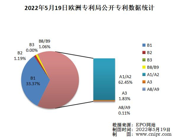 2022年5月19日,欧洲专利局(EPO)公开A类以及B类专3776件。经审查的授权专利说明书(B1):1260件,占总公开量的33.37%;修正的专利说明书(B2):45件,占总公开量的1.19%;限制程序后公布(B3):0件,占总公开量的0.00%;授权专利扉页的更正/授权专利全文的更正(B8/B9):40件,占总公开量的1.06%;专利申请公布(A1/A2):2358件,占总公开量的62.45%;检索报告(A3):69件,占总公开量的1.83%;专利扉页更正/专利全文更正(A8/A9):4件,占总公开量的0.11%。