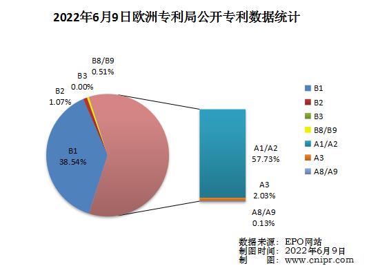 2022年6月9日,欧洲专利局(EPO)公开A类以及B类专3941件。经审查的授权专利说明书(B1):1519件,占总公开量的38.54%;修正的专利说明书(B2):42件,占总公开量的1.07%;限制程序后公布(B3):0件,占总公开量的0.00%;授权专利扉页的更正/授权专利全文的更正(B8/B9):20件,占总公开量的0.51%;专利申请公布(A1/A2):2275件,占总公开量的57.73%;检索报告(A3):80件,占总公开量的2.03%;专利扉页更正/专利全文更正(A8/A9):5件,占总公开量的0.13%。