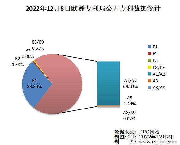 2022年12月8日,欧洲专利局(EPO)公开A类以及B类专利4937件。经审查的授权专利说明书(B1):1392件,占总公开量的28.20%;修正的专利说明书(B2):29件,占总公开量的0.59%;限制程序后公布(B3):0件,占总公开量的0.00%;授权专利扉页的更正/授权专利全文的更正(B8/B9):26件,占总公开量的0.53%;专利申请公布(A1/A2):3423件,占总公开量的69.33%;检索报告(A3):66件,占总公开量的1.34%;专利扉页更正/专利全文更正(A8/A9):1件,占总公开量的0.02%。