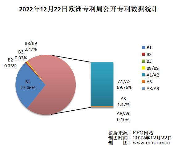 2022年12月22日,欧洲专利局(EPO)公开A类以及B类专利5099件。经审查的授权专利说明书(B1):1400件,占总公开量的27.46%;修正的专利说明书(B2):37件,占总公开量的0.73%;限制程序后公布(B3):1件,占总公开量的0.02%;授权专利扉页的更正/授权专利全文的更正(B8/B9):24件,占总公开量的0.47%;专利申请公布(A1/A2):3557件,占总公开量的69.76%;检索报告(A3):75件,占总公开量的1.47%;专利扉页更正/专利全文更正(A8/A9):5件,占总公开量的0.10%。